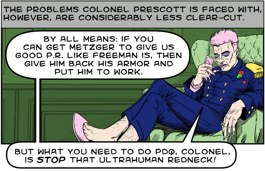 Rich Freeman, AKA Dr. Detente, is in a similar situation as Metzger. But he is being deployed. Also, he is ultrahuman and can’t be rendered impotent as easily.