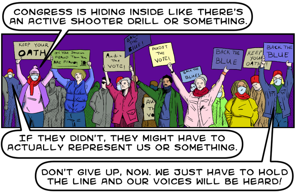 Meanwhile, in America’s Capital, under the naive assumption that their “representatives” are interested in honest elections, a multitude of Americans have assembled peacefully to petition the government for redress of grievances.
