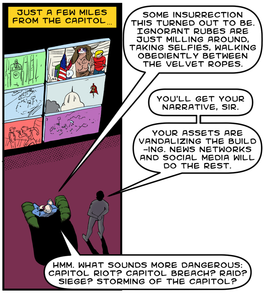 Roy De L’ombre orders his media conglomerates to initially go with “Capitol Breach” and “storming of the capitol.”
