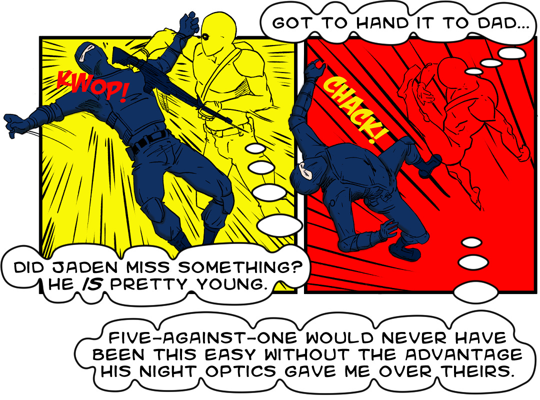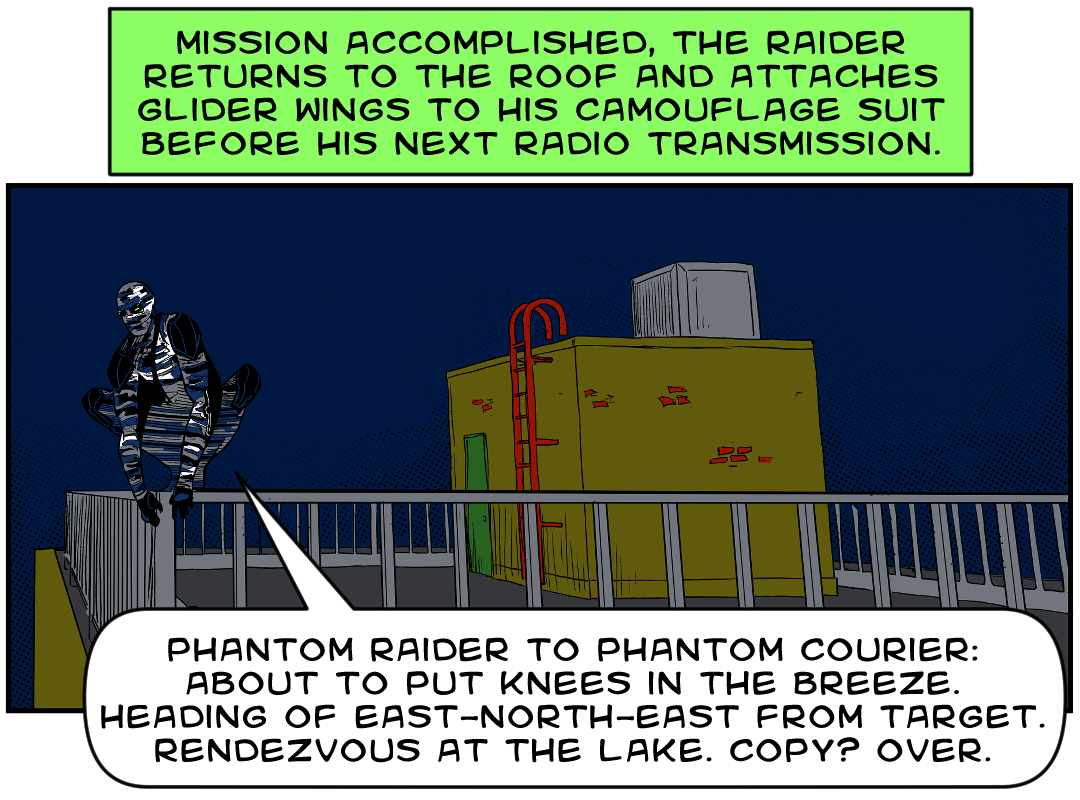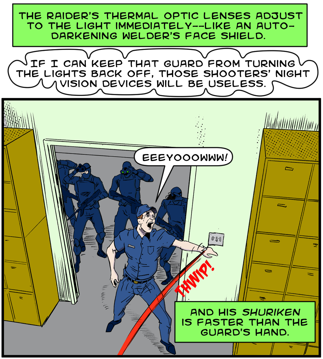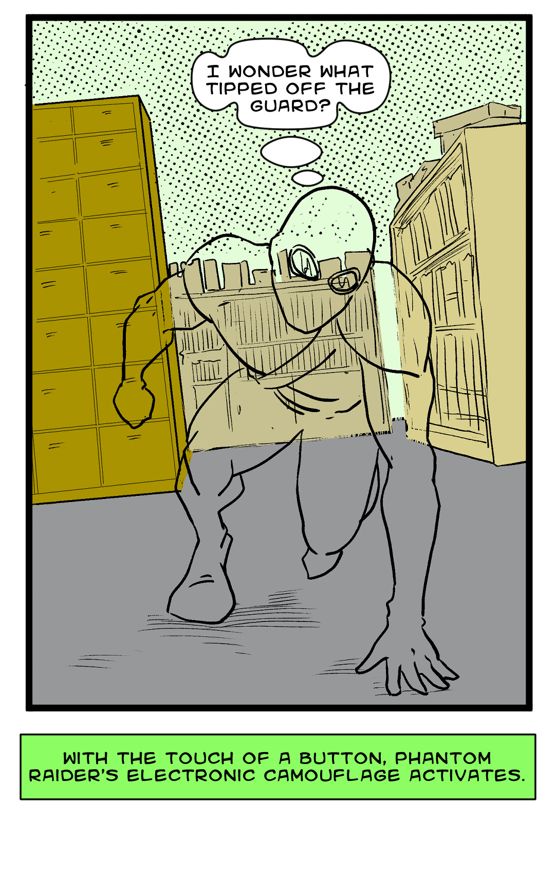 The Phantom Raider has infiltrated a secure facility to steal some exculpatory evidence slated for destruction. As he’s preparing for exfil, the lights suddenly turn on, catching him out in the open.